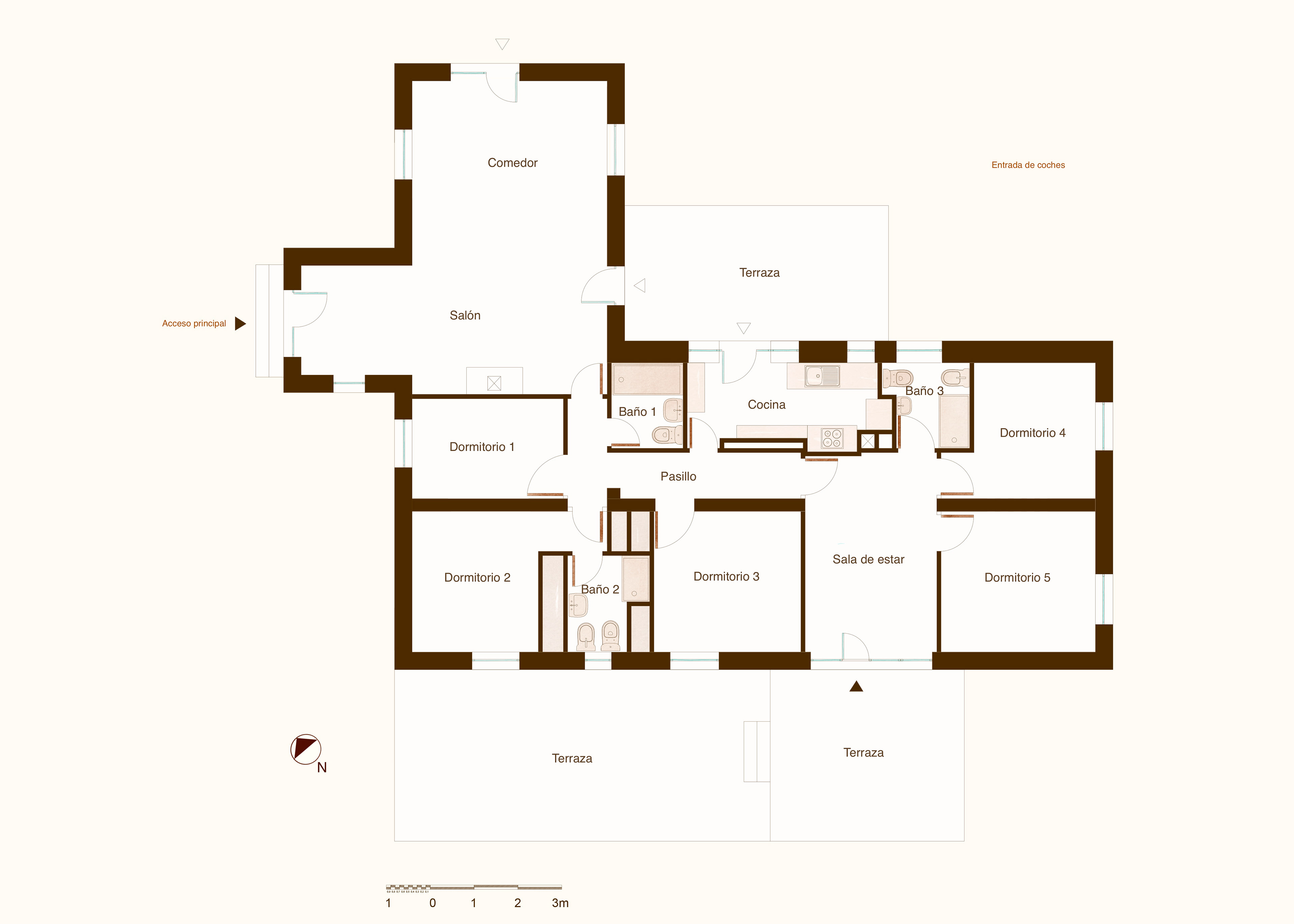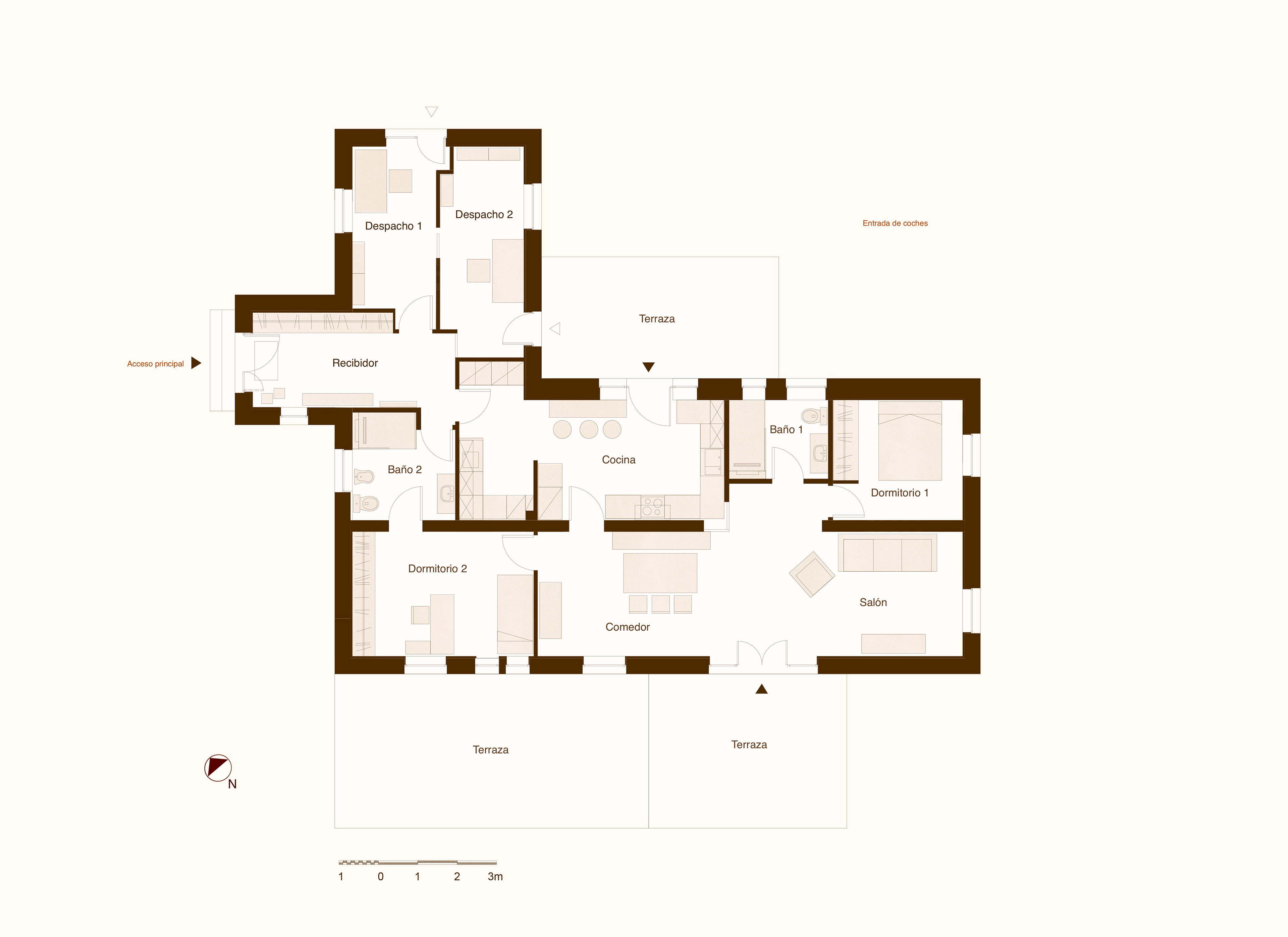 Desde el principio el objetivo fue dar la vuelta a la distribución existente, pensada para los veranos y vacaciones de una familia con 4 hijos. El salón y el comedor que estaban localizados en la zona norte se trasladaron a la zona sur destinando ese espacio para ubicar los despachos. La entrada y la cocina funcionan como un eje articulador de la vivienda: en el norte, quedando algo más independientes los despachos y al otro lado del eje dejamos el resto de la vivienda.