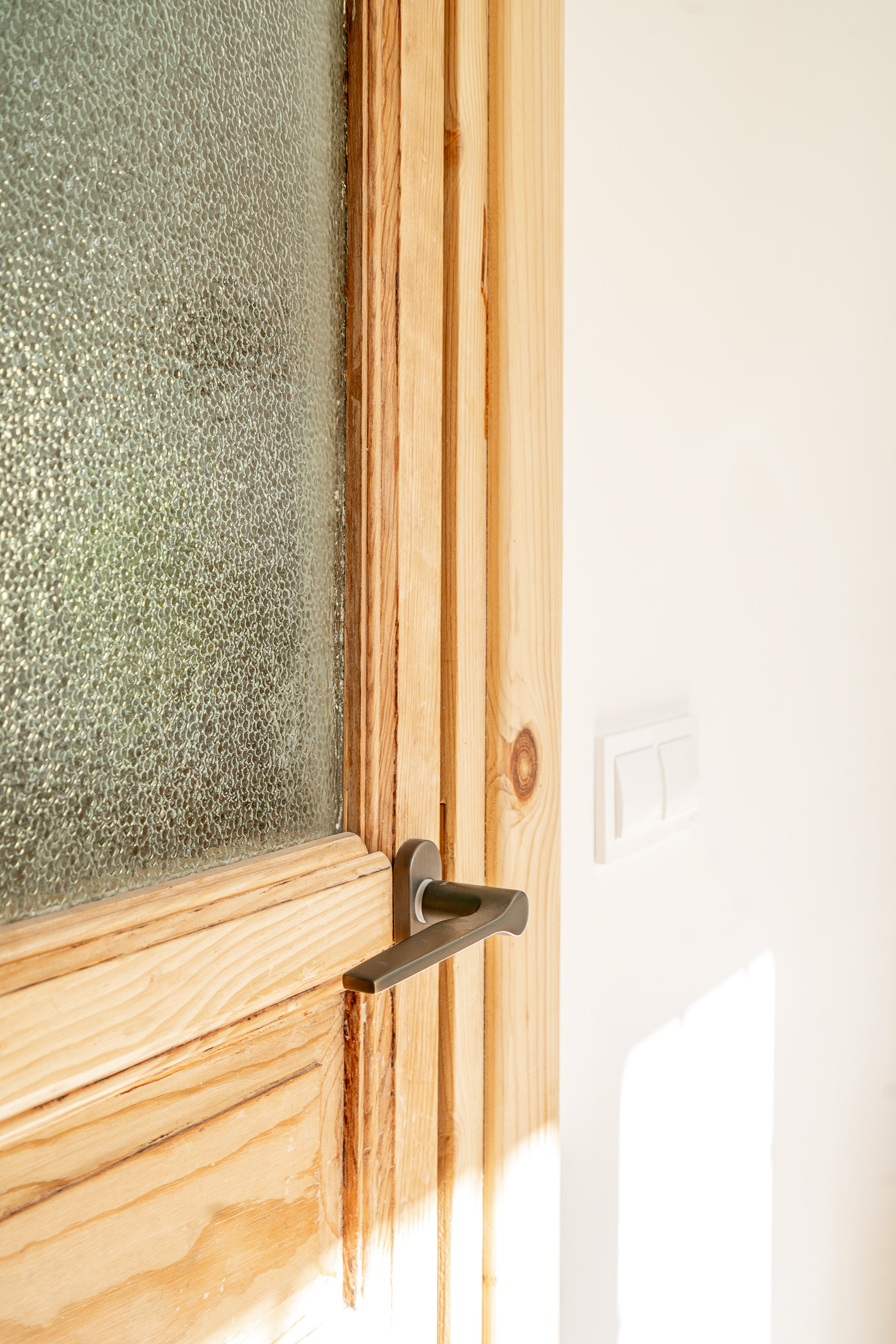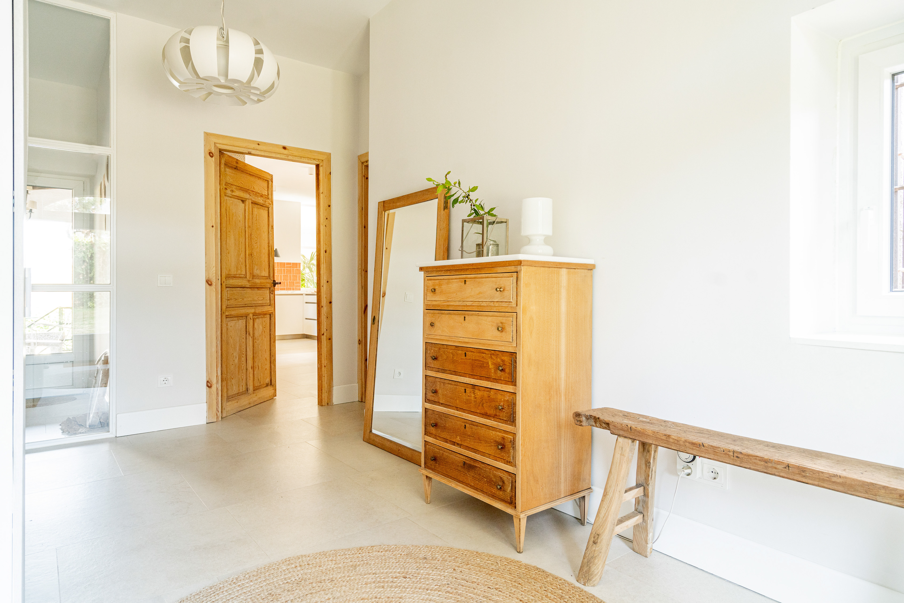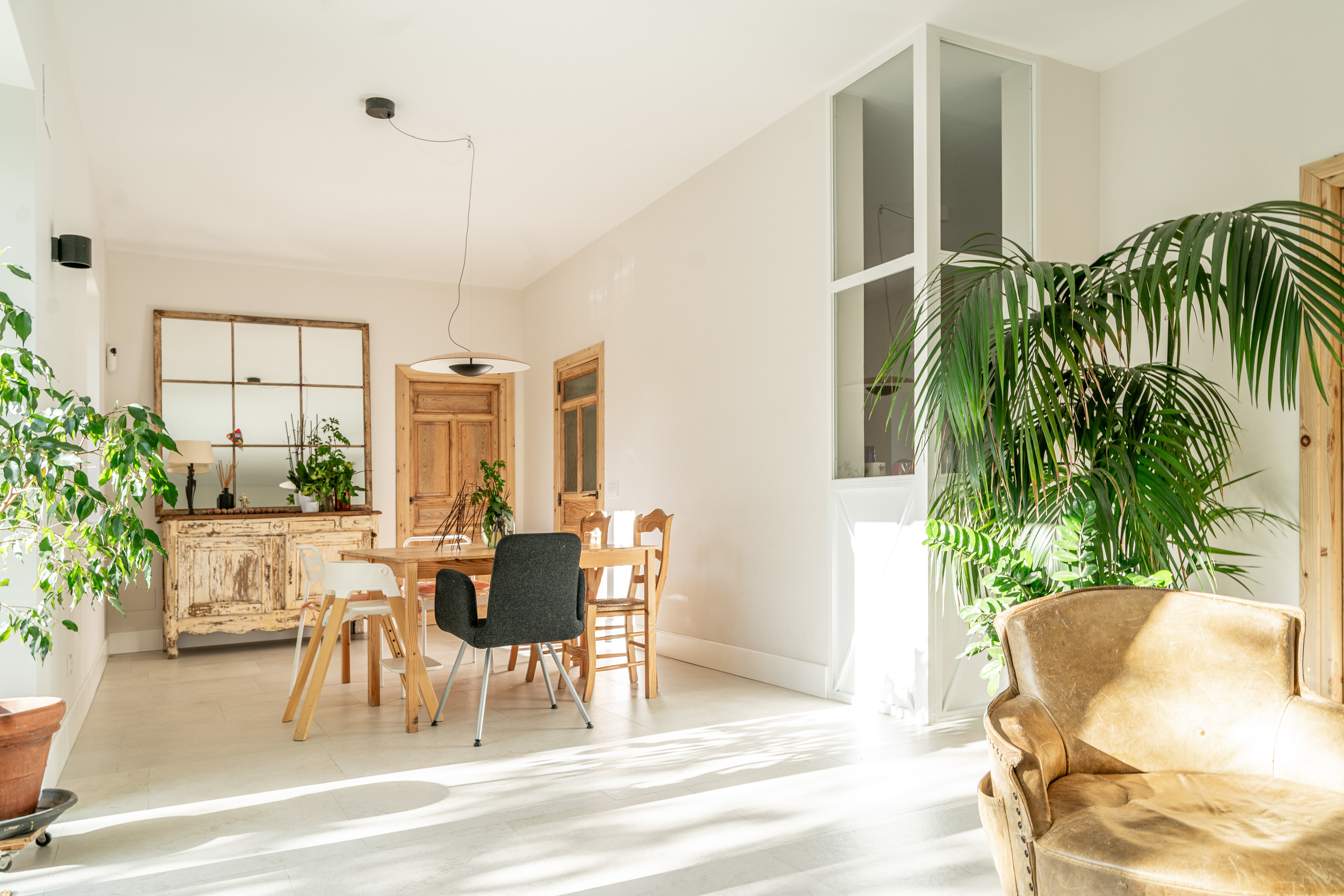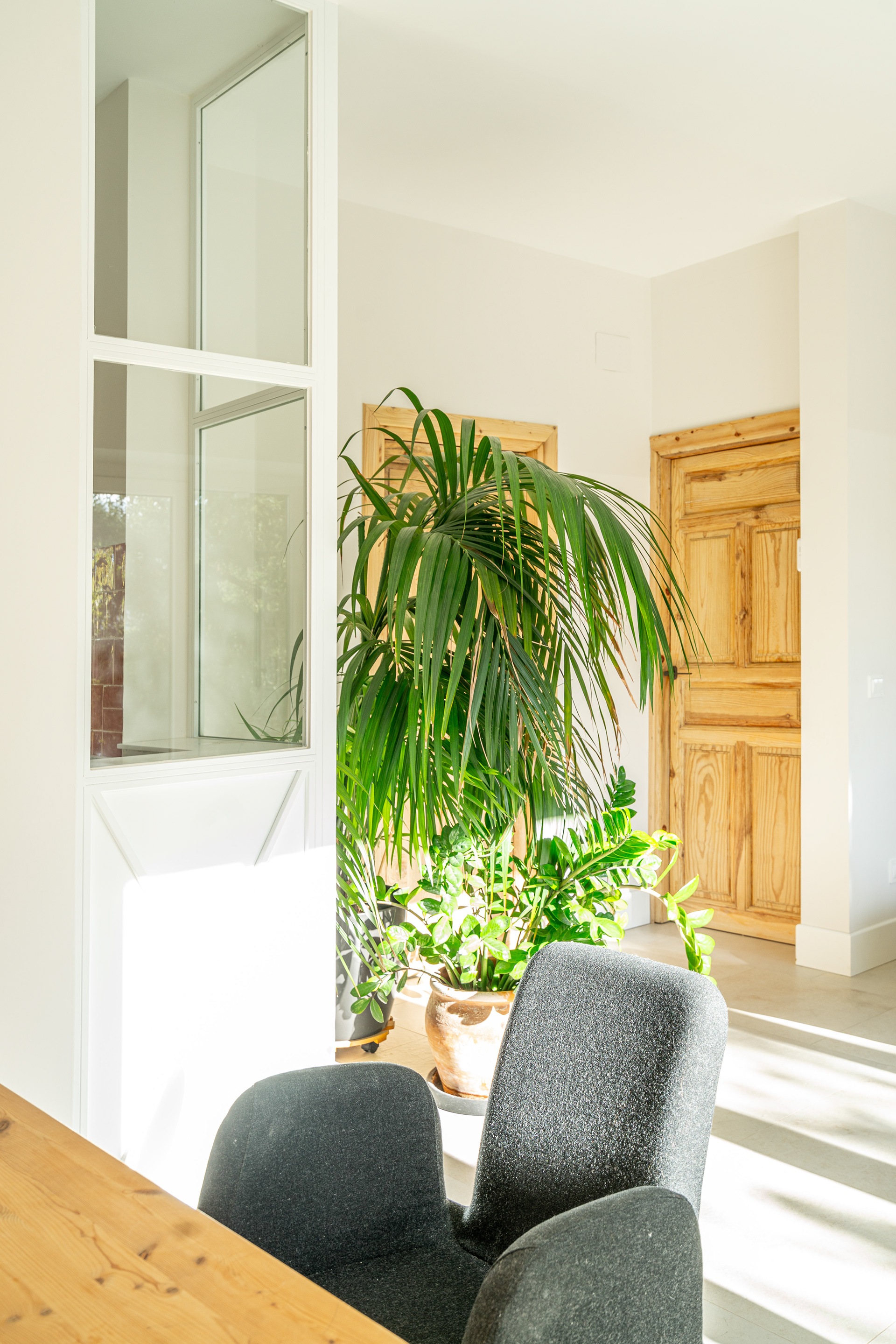 Para acentuar la magia de la luz uno de los recursos usados en esta vivienda fue romper muros con cristaleras. Estas juegan un papel importante a lo largo de todo el día. Mientras que por la mañana la luz cálida del este se cuela en el salón por la vidriera, es por la tarde cuando la luz cálida del suroeste entra en la cocina a través de esa misma vidriera.
