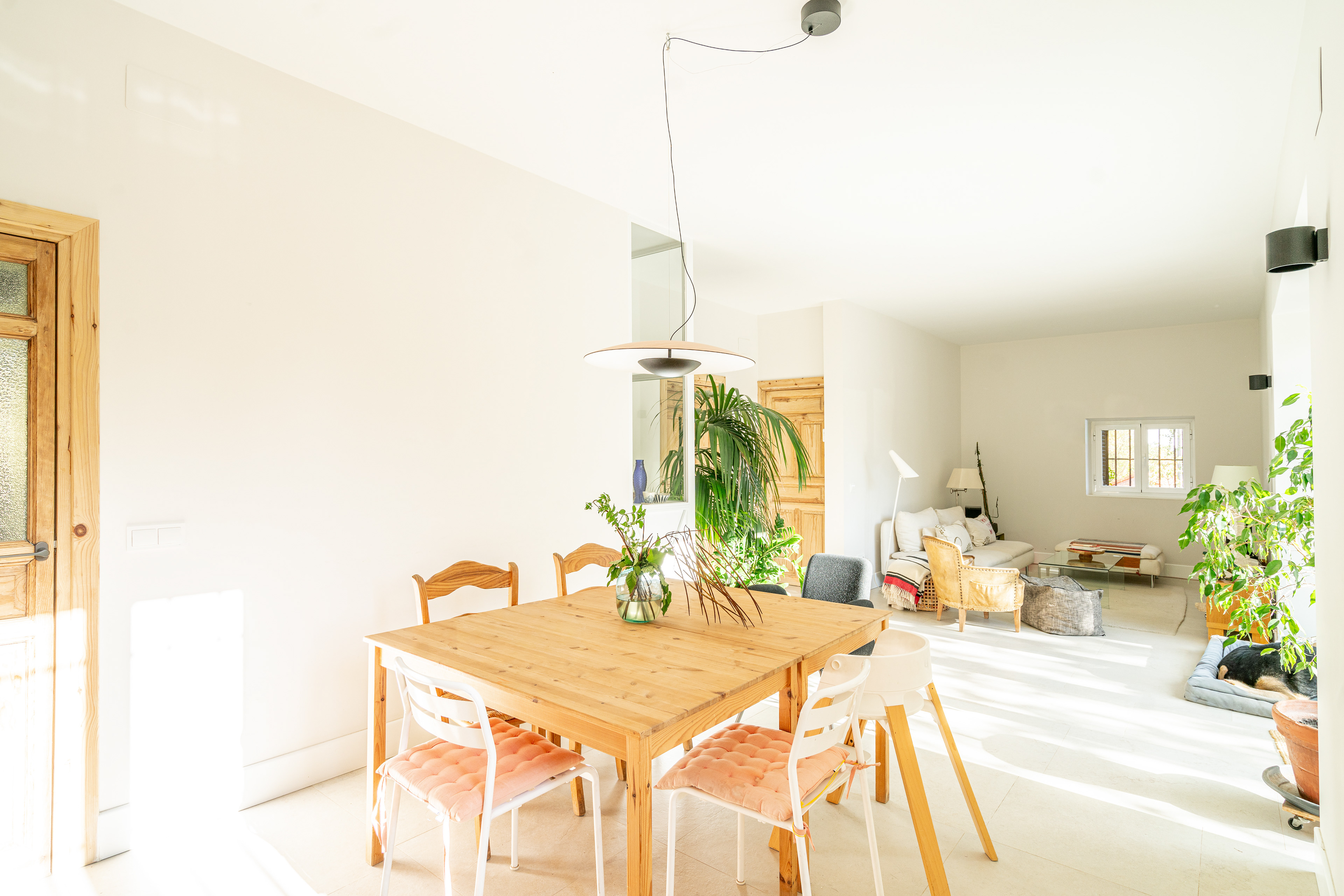 En la fachada sur queríamos aprovechar un gran hueco preexistente que da a una terraza para que actuase como entrada de luz constante al interior, desde antes de medio día hasta última hora de la tarde. Por ello dejamos esa zona lo más diáfana posible y ubicamos allí el salón y el comedor.
