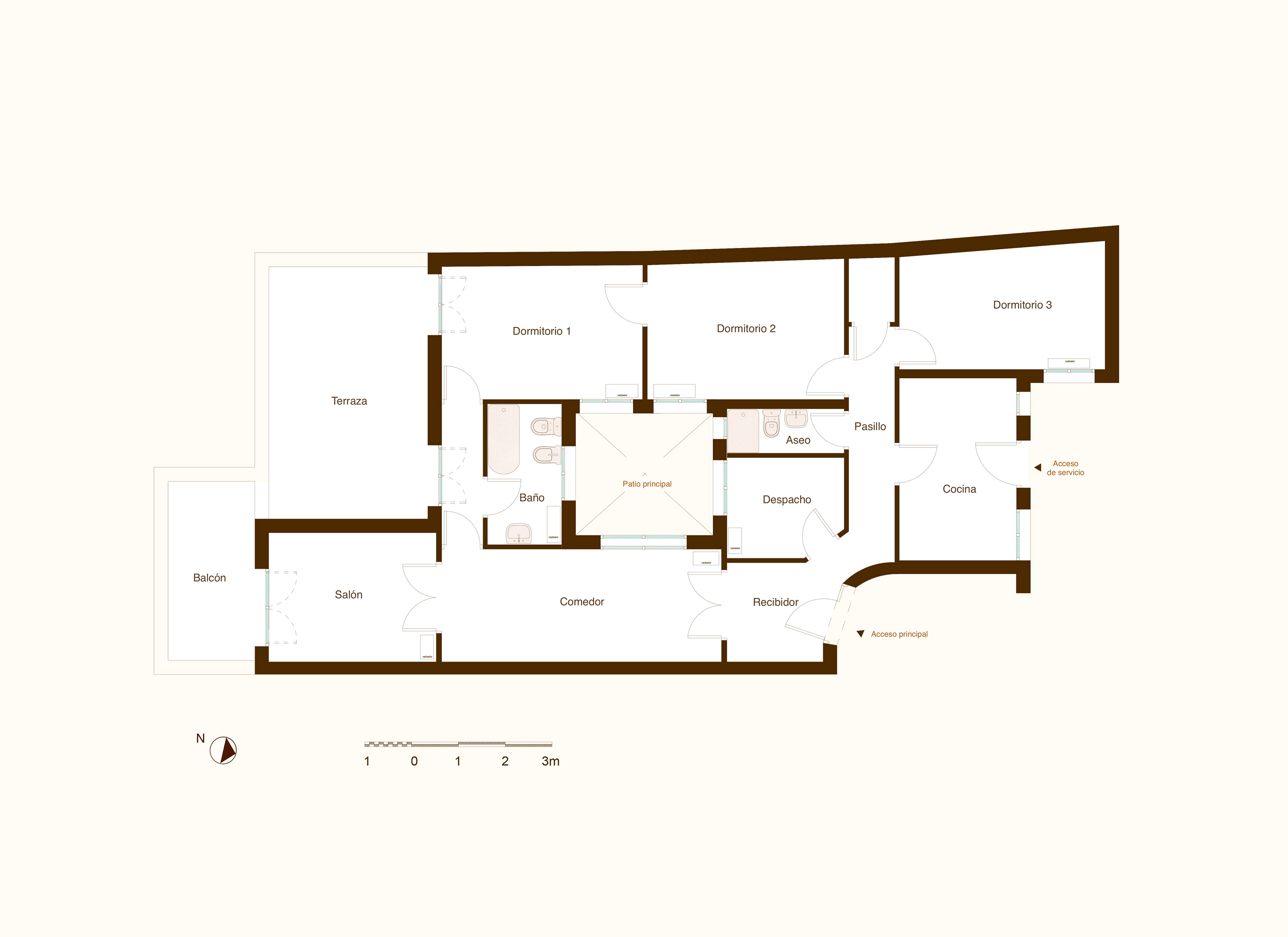 La vivienda mantenía la distribución original de principios de los años 30, con pasillos y muy compartimentada lo que bloqueaba el acceso de luz en algunos puntos. Tiene una morfología muy interesante ya que toda la vivienda se desarrolla alrededor de un patio interior al que dan las ventanas de algunas habitaciones, sin que existan ventanas de otros vecinos a la misma altura. Esto se traduce en un elevado nivel de privacidad.