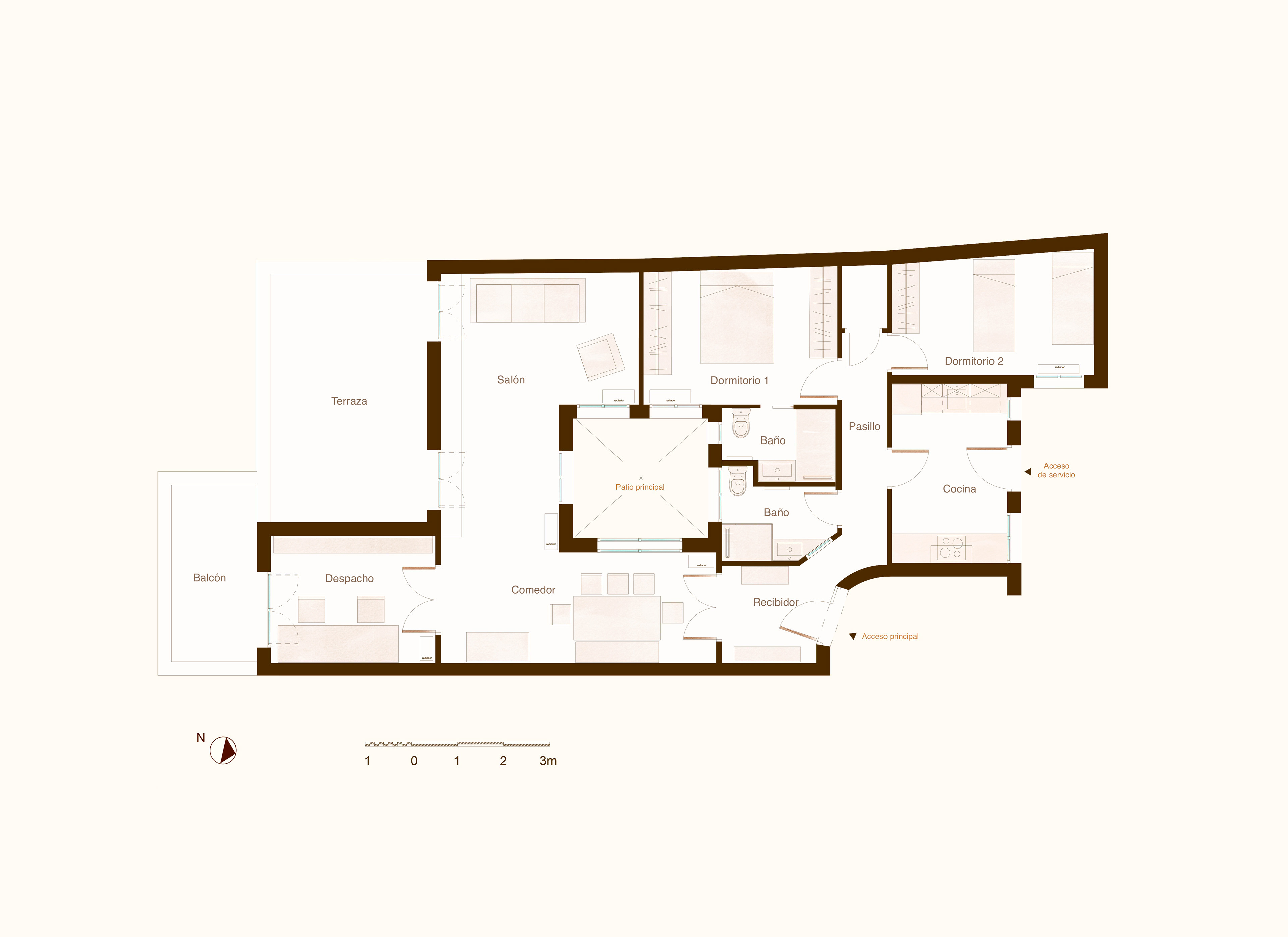 En esta ocasión la orientación fue determinante a la hora de rediseñar los espacios siendo uno de los ejes de trabajo. Dejamos al descubierto la estructura del piso en la zona orientada al sur para poder disfrutar de buena luz en las zonas de uso durante el día. Es ahí donde ubicamos el salón y el comedor, así como los despachos. Concibiéndola como una zona más diáfana bañada por una cálida luz durante todo el día. La parte posterior y la orientada al norte la reservamos para las habitaciones, baños y cocina. De esta manera acompañamos los ritmos circadianos de los habitantes.