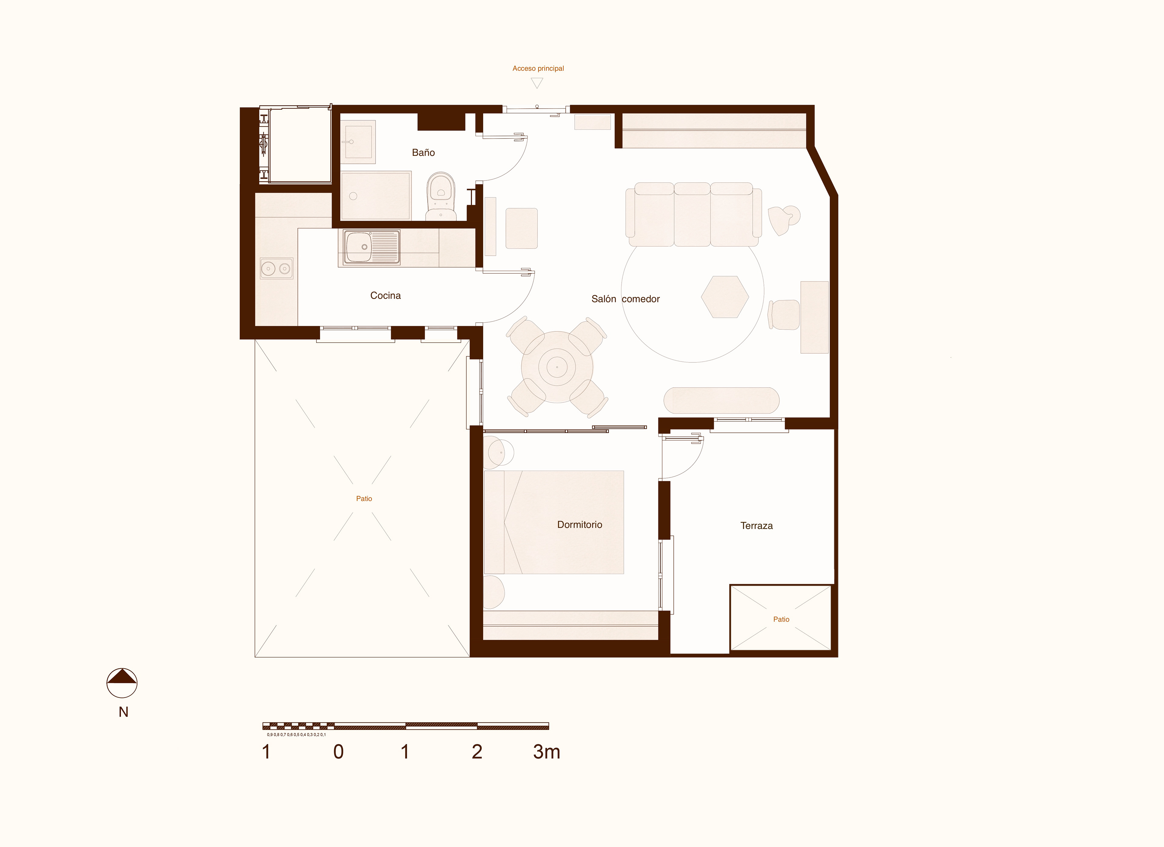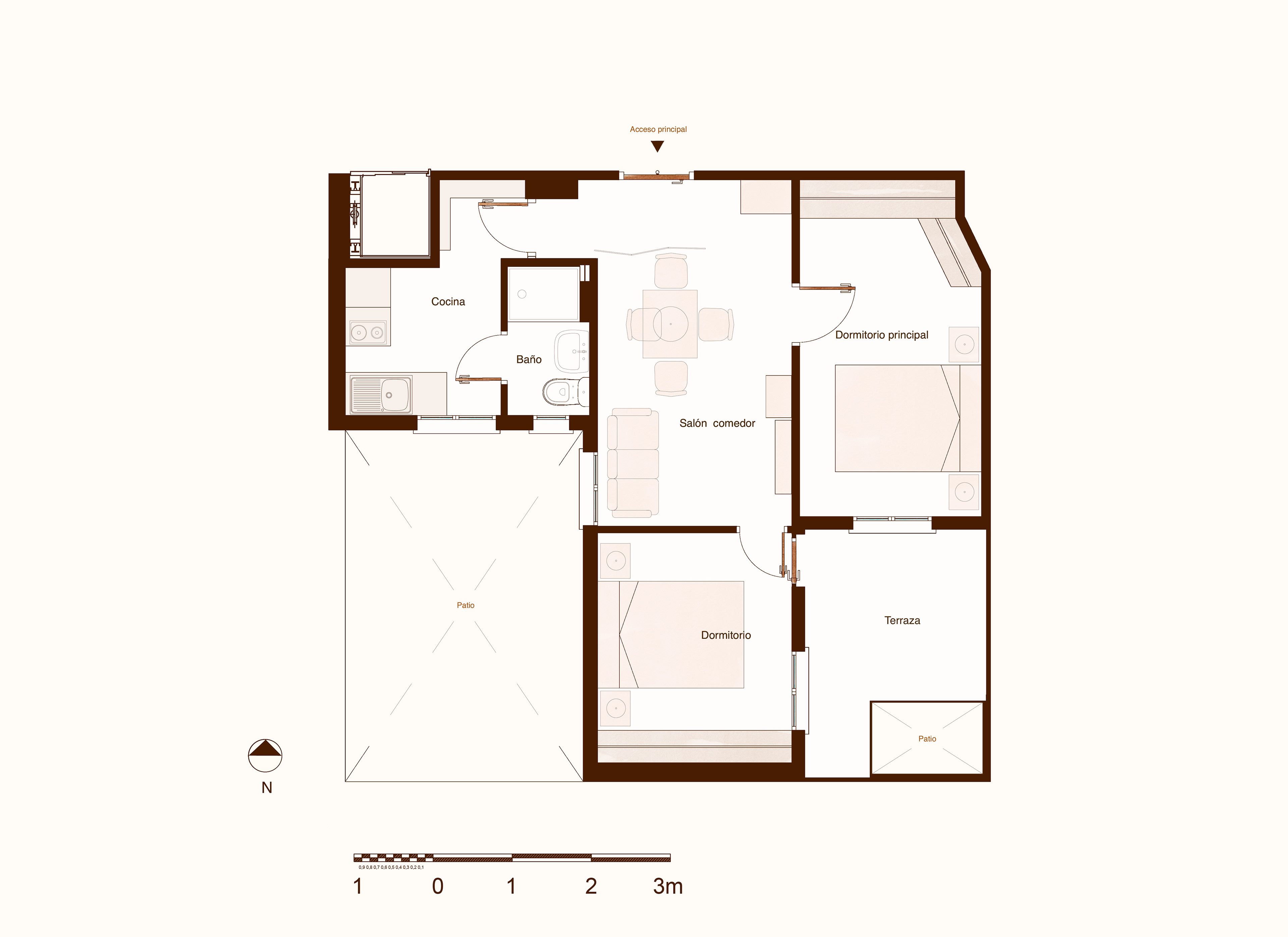 Se optó por dejar un único dormitorio eliminando pasillos y lograr un espacio abierto y desahogado en el salón y comedor. La zona de cuartos húmedos se rediseñó para ganar más espacio en ambas estancias y evitar que el baño diera a la cocina.